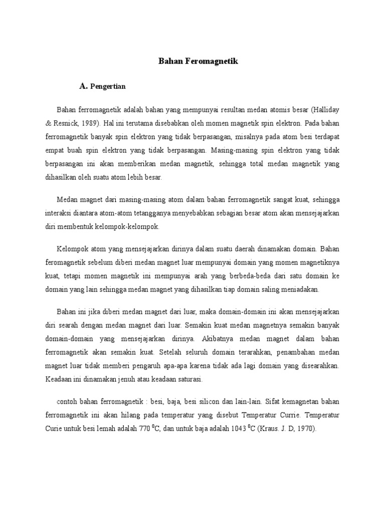 Bahan ferromagnetik adalah bahan yang mempunyai resultan medan atomis besar Halliday Resnick 1989. Bahan-bahan feromagnetik yang digunakan yaitu besi kobalt dan nikel. Sifat kemagnetan bahan ferromagnetik ini akan hilang pada temperatur yang disebut Temperatur Currie.